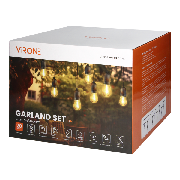 | Other features: | Trzonek E27, odległość między żarówkami 47 cm, uchwyt na montaż na lince nad żarówkami, możliwość łączenia girland, kolor czarny |